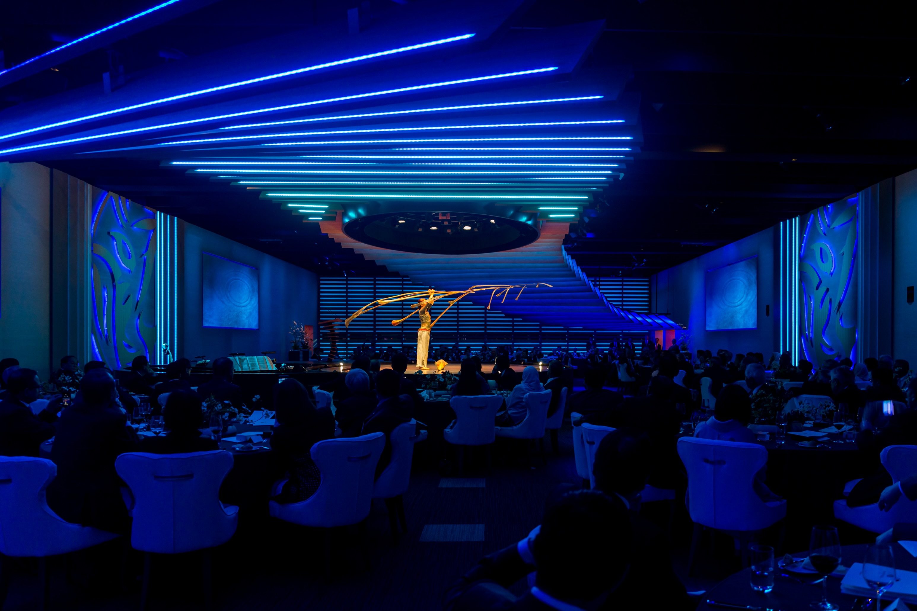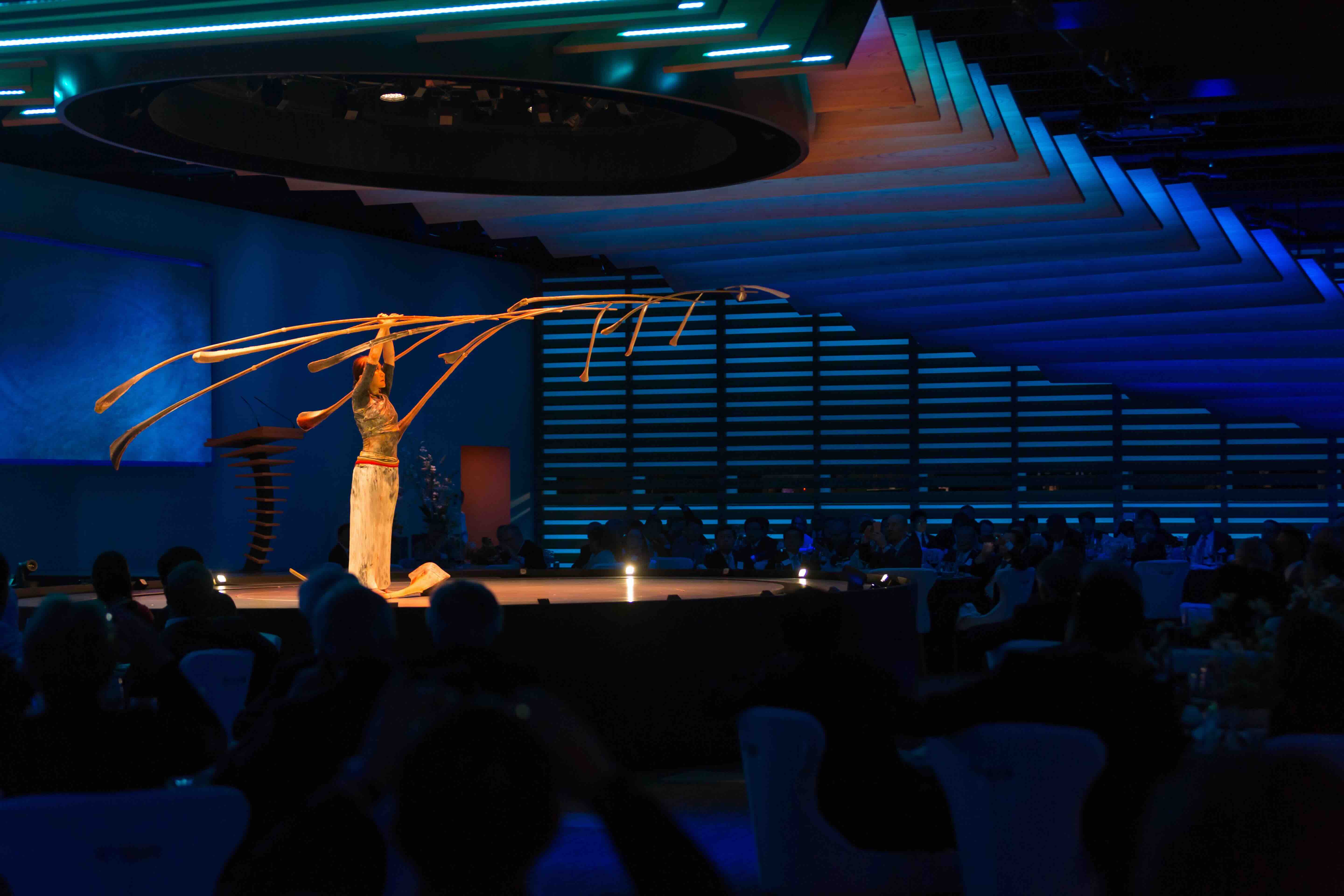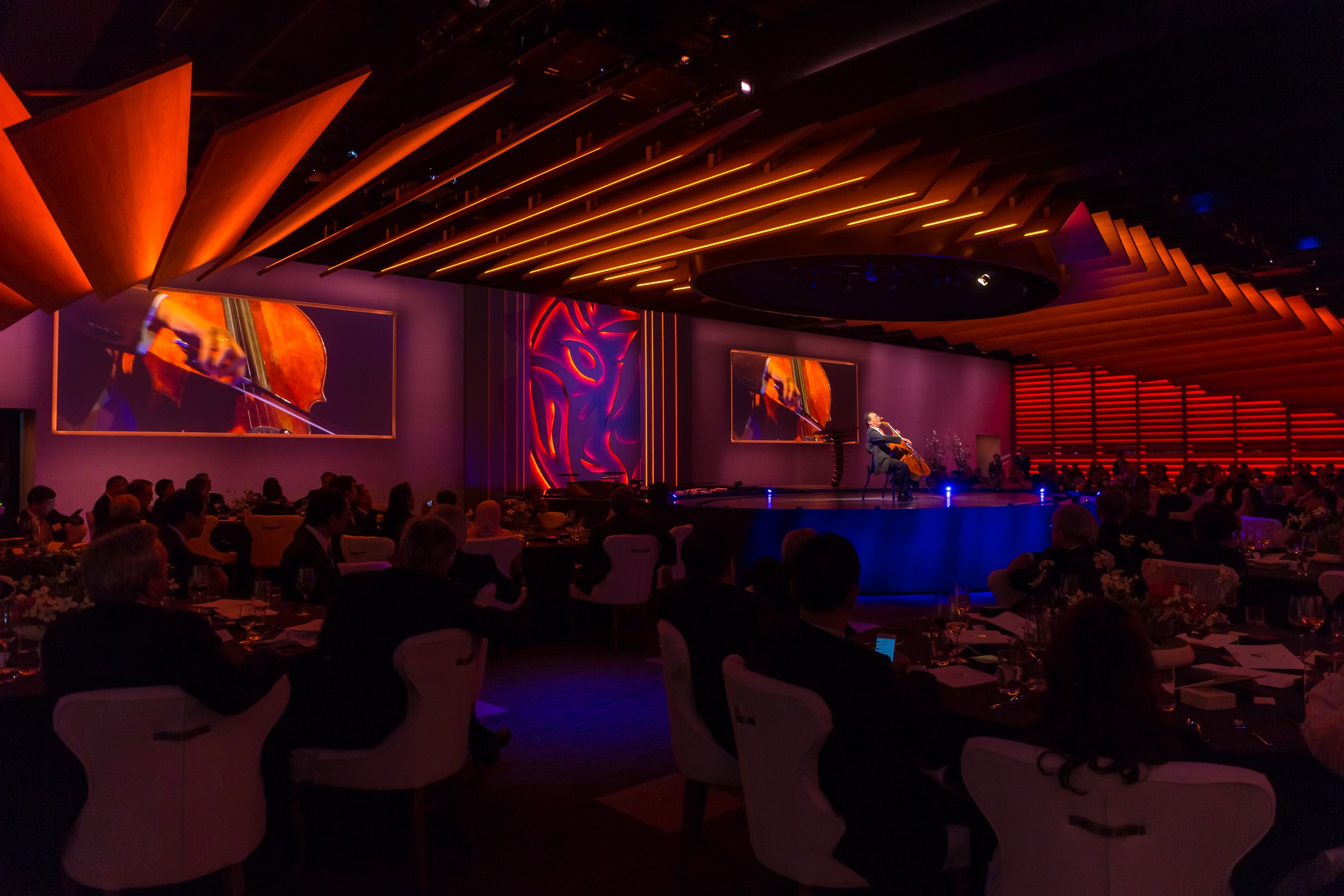 A violinist emerged from a living sculpture of petals, evoking growth through decisive beauty. An artist moved in quiet fluidity, balancing elegance and strength in motion. And finally, Yo Yo Ma took the stage with a performance that transcended mastery, offering something beyond skill, presence, soul, and reverence. All of this unfolded beneath a sculptural wooden ribbon, handcrafted to sweep across the room like a gesture suspended in time.