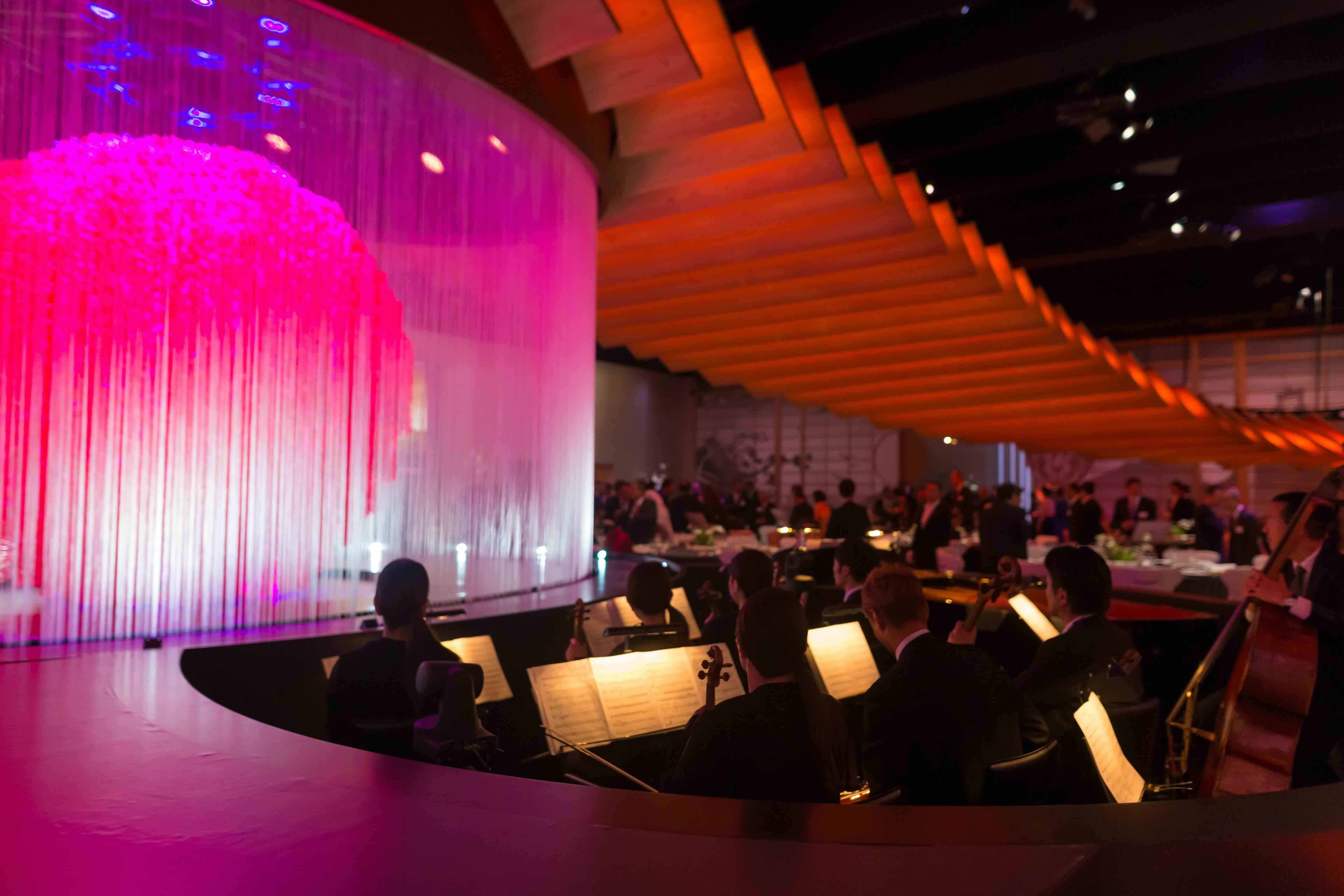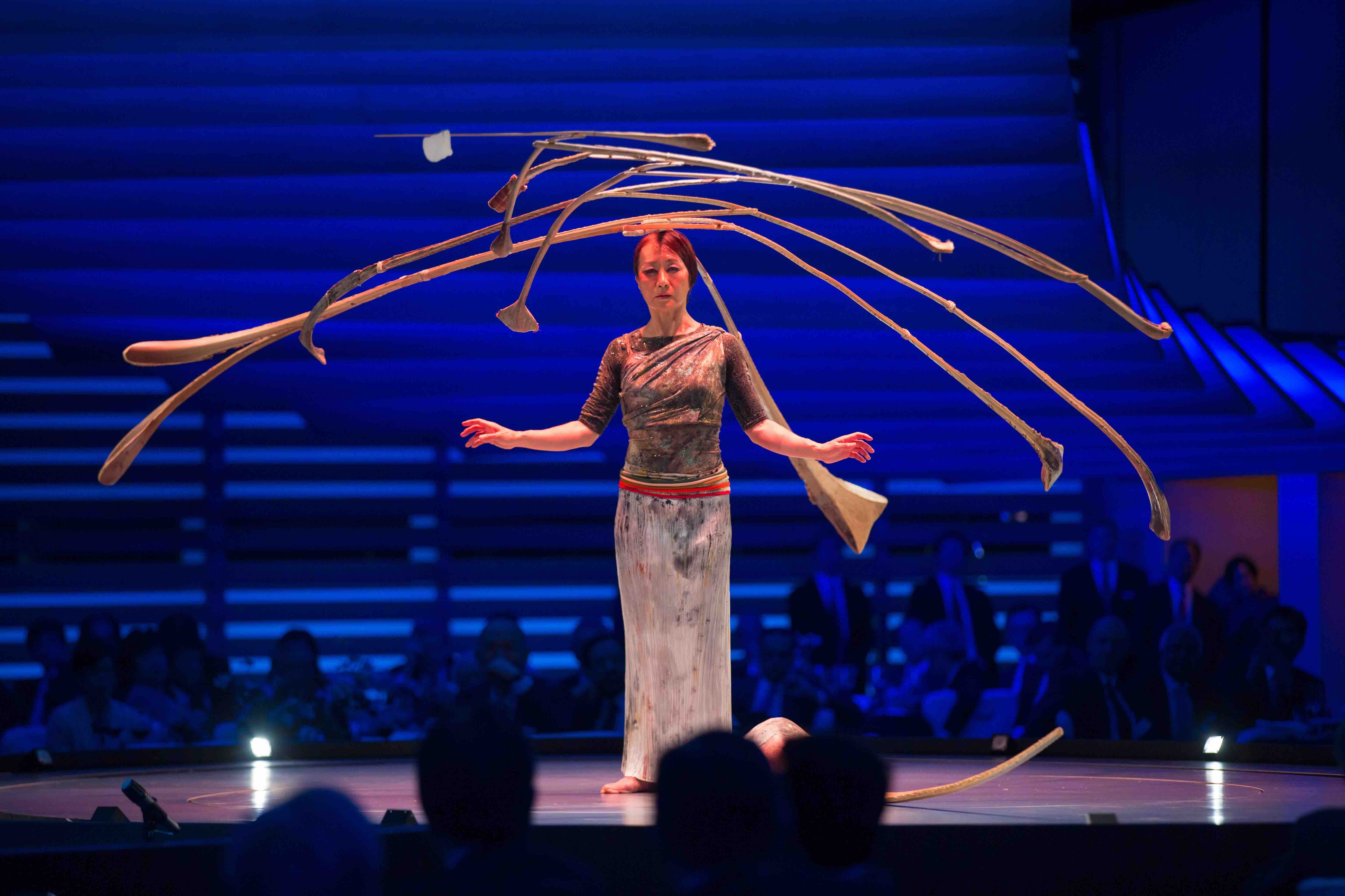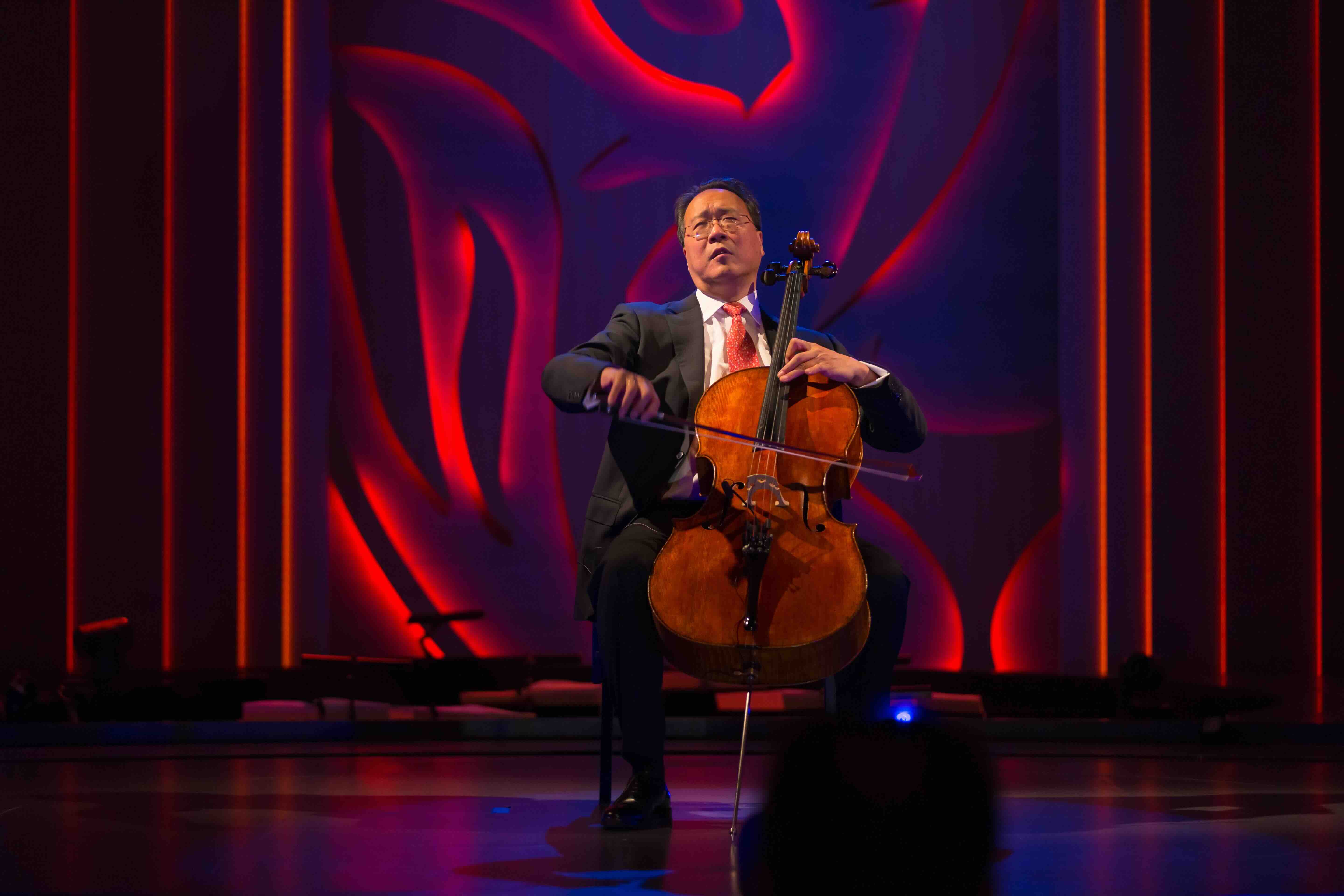 A violinist emerged from a living sculpture of petals, evoking growth through decisive beauty. An artist moved in quiet fluidity, balancing elegance and strength in motion. And finally, Yo Yo Ma took the stage with a performance that transcended mastery, offering something beyond skill, presence, soul, and reverence. All of this unfolded beneath a sculptural wooden ribbon, handcrafted to sweep across the room like a gesture suspended in time.